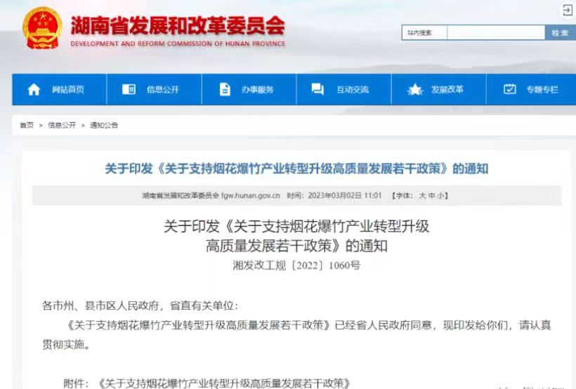 今天湖南省發改委官網公布關于印發《關于支持煙花爆竹產業轉型升級高質量發展若干政策》的通知具體內容如下:
